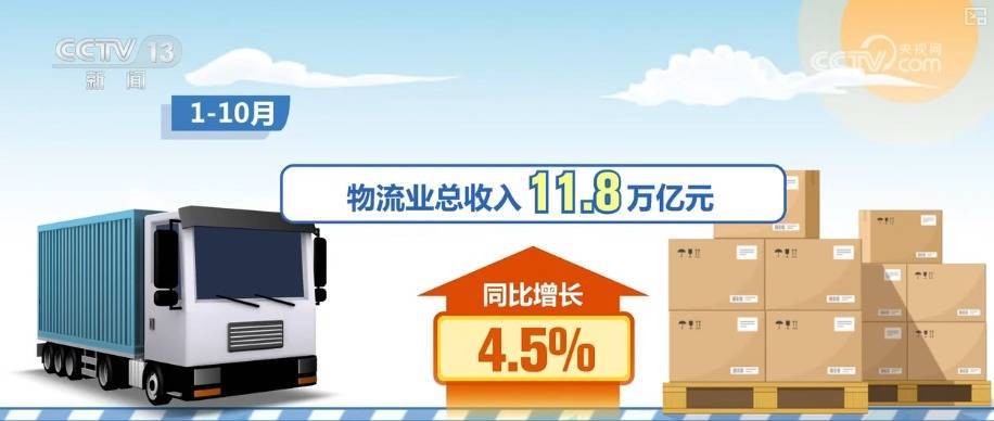 1—10月,物流业总收入11.8万亿元,同比增长4.5%。运输物流结构持续调整优化,粮食、棉花、光伏、化工等长运距货类向铁路、水上运输调整持续推进。
